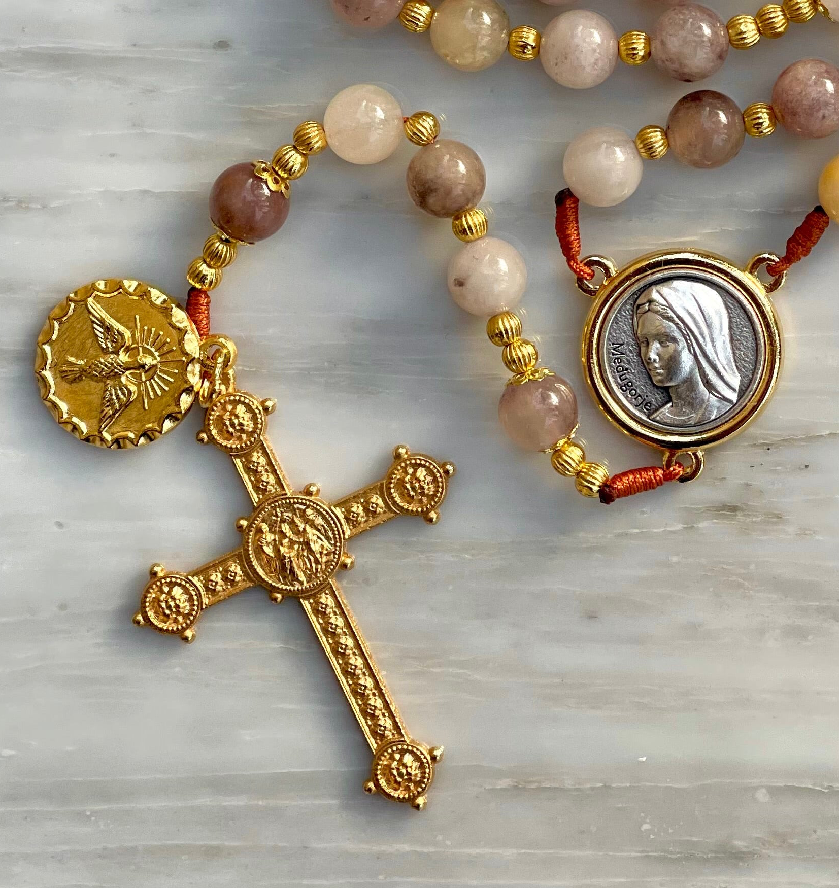 Sand Taupe With Holy Spirit Medal Semi Precious Stone Rosary.