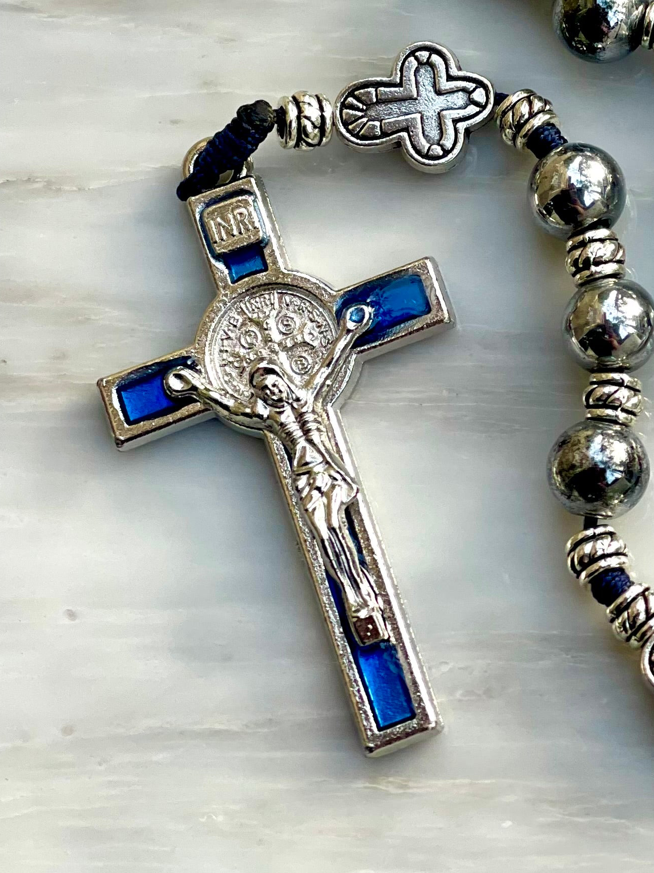 Silver Hematite With Blue Details Semi Precious Stone Rosary.